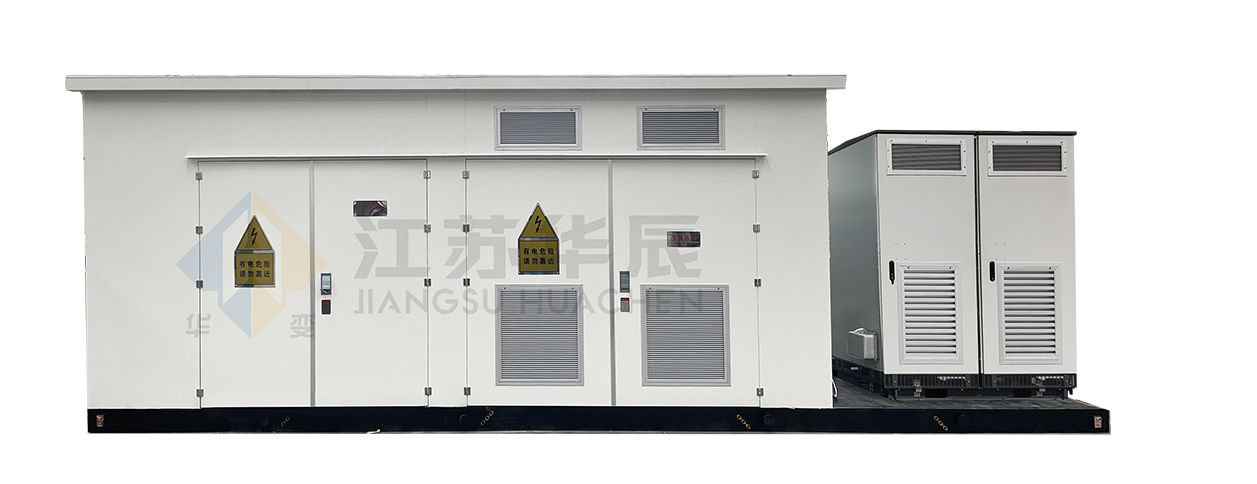 The unit is composed of the energy storage converter (PCS), busbar frame, low-voltage room (communication + power distribution), dry-type transformer, high-voltage room (equipped with vacuum load switch/breaker), and the unit's enclosure.